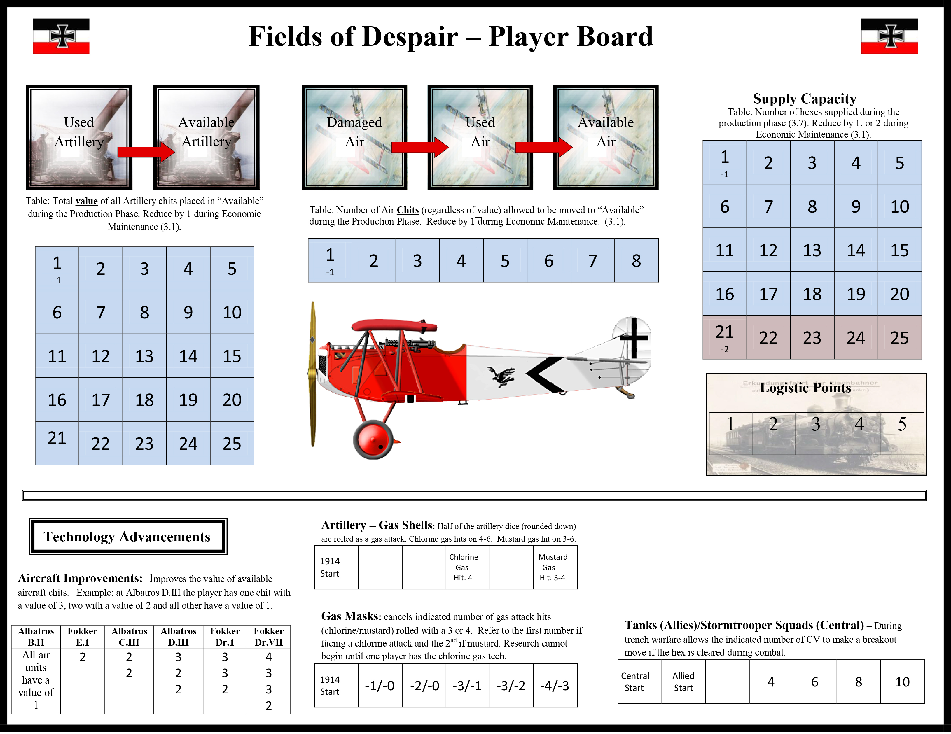 Car FoD est aussi un jeu où la dimension économique pèsera lourd. A chaque tour, les joueurs recevront des Points d’Economie qu’ils devront gérer au mieux pour faire avancer leur cause. Les possibilités industrielles des 2 camps trinquent sérieusement du fait de la guerre, et les capacités à produire des canons ou des avions, à les maintenir en état ou à ravitailler les troupes ne cesseront de se dégrader avec le temps (assez étonnamment d’ailleurs, le niveau de production de guerre français, entre autres, ayant considérablement augmenté pendant le conflit…) .